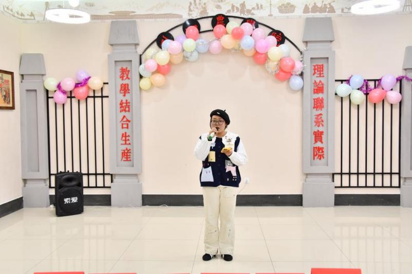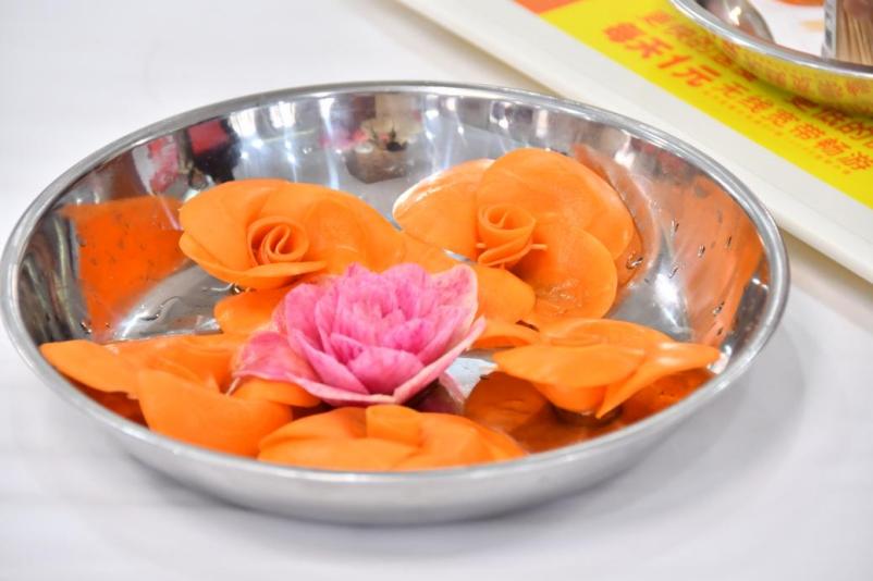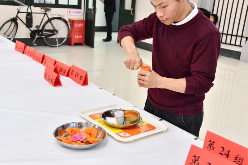 最令人惊喜的是2024级食品加工与安全专业刘文赋的“实用萝卜雕刻摆盘”表演——普通萝卜在他手中变成精致艺术品,既展现食品加工技艺,又融合民俗实践,赢得全场喝彩。