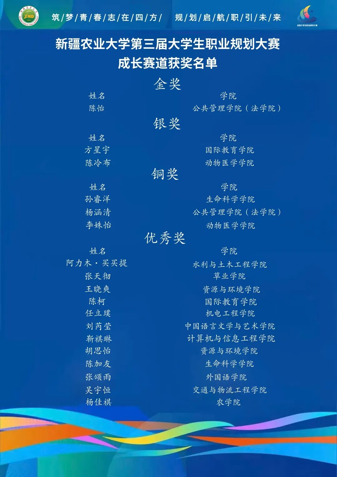 经过全天的激烈角逐,本次职业规划大赛校级决赛顺利完成各项赛程,最终评选出金奖3名、银奖6名、铜奖9名及优秀奖21名。