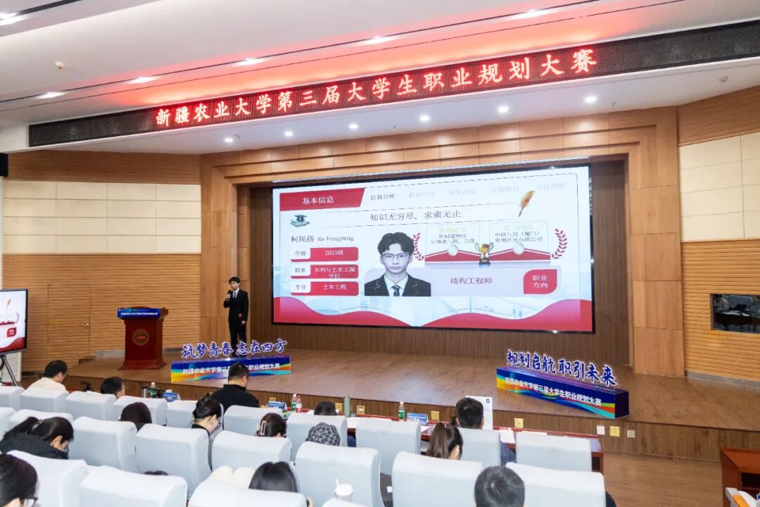 为引导我校学子树立科学的职业规划意识,提升就业竞争力,增强职业发展能力,搭建展现自我、追逐梦想的优质平台,12月25日,由新疆农业大学学生工作部(学生处)主办的第三届大学生职业规划大赛校级决赛在八一会堂问学厅顺利举行。来自各学院的优秀选手齐聚一堂,展开了一场关于未来职业蓝图的精彩比拼,为现场师生呈现了一场思想与实践深度融合的精彩展示。