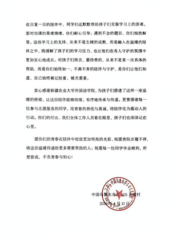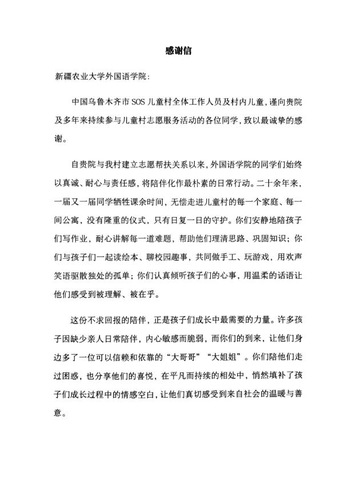 二十余年的坚守与陪伴,得到了乌鲁木齐市SOS儿童村的高度认可。近期,活动收到了儿童村的官方感谢信,信中对学院二十多年持续开展的义教活动给予了充分肯定,也对志愿者们的陪伴与付出表达了诚挚的谢意。