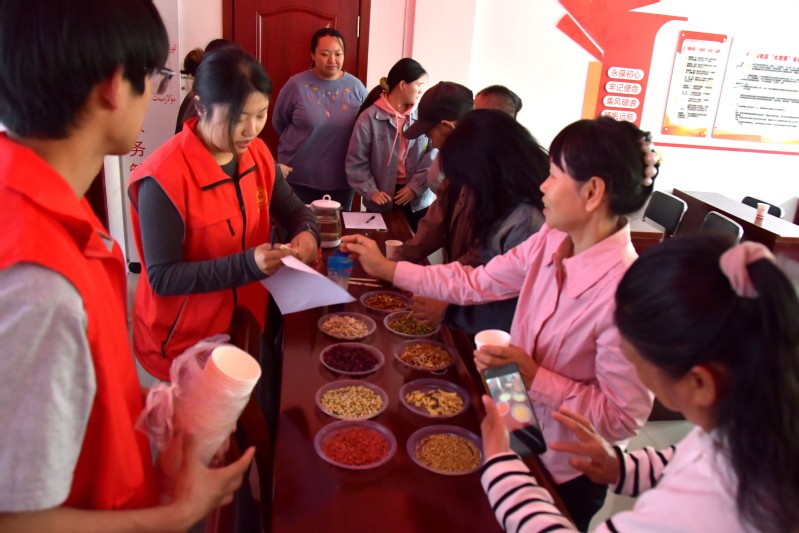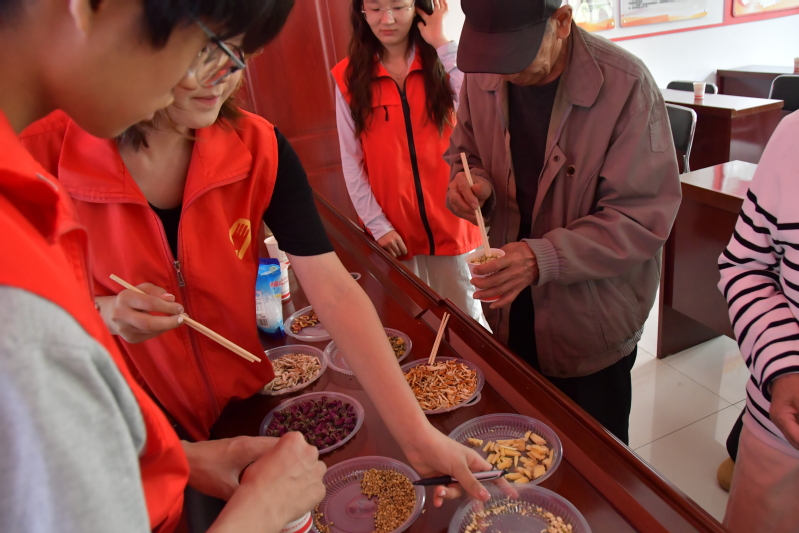 志愿者们提前准备了枸杞、玫瑰、陈皮、炒麦芽等多种养生食材,居民们拿着筷子亲手搭配,跟着志愿者学习适合自己的养生茶饮配方。一位社区老人笑着说:“在家门口就能跟着大学生学养生,还能亲手试试,比自己瞎琢磨靠谱多啦!”